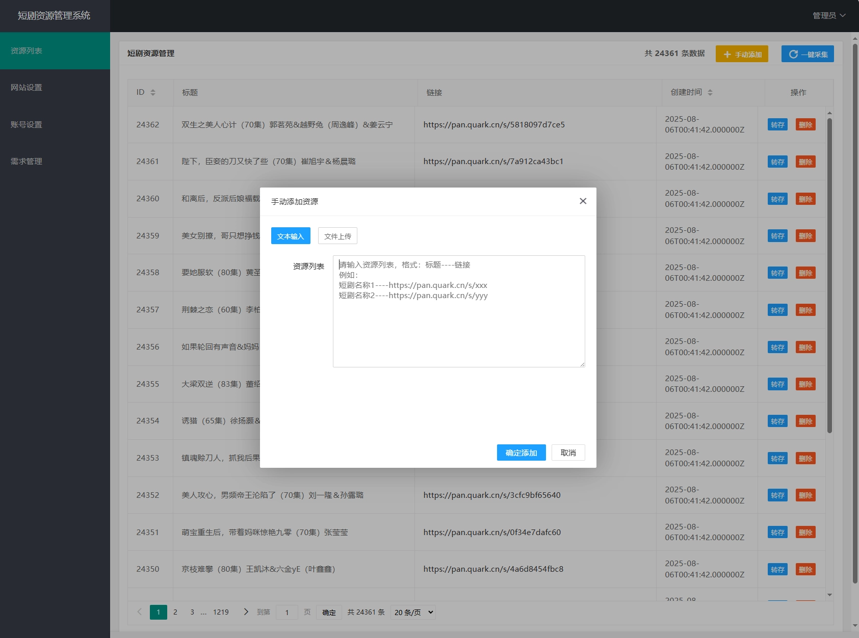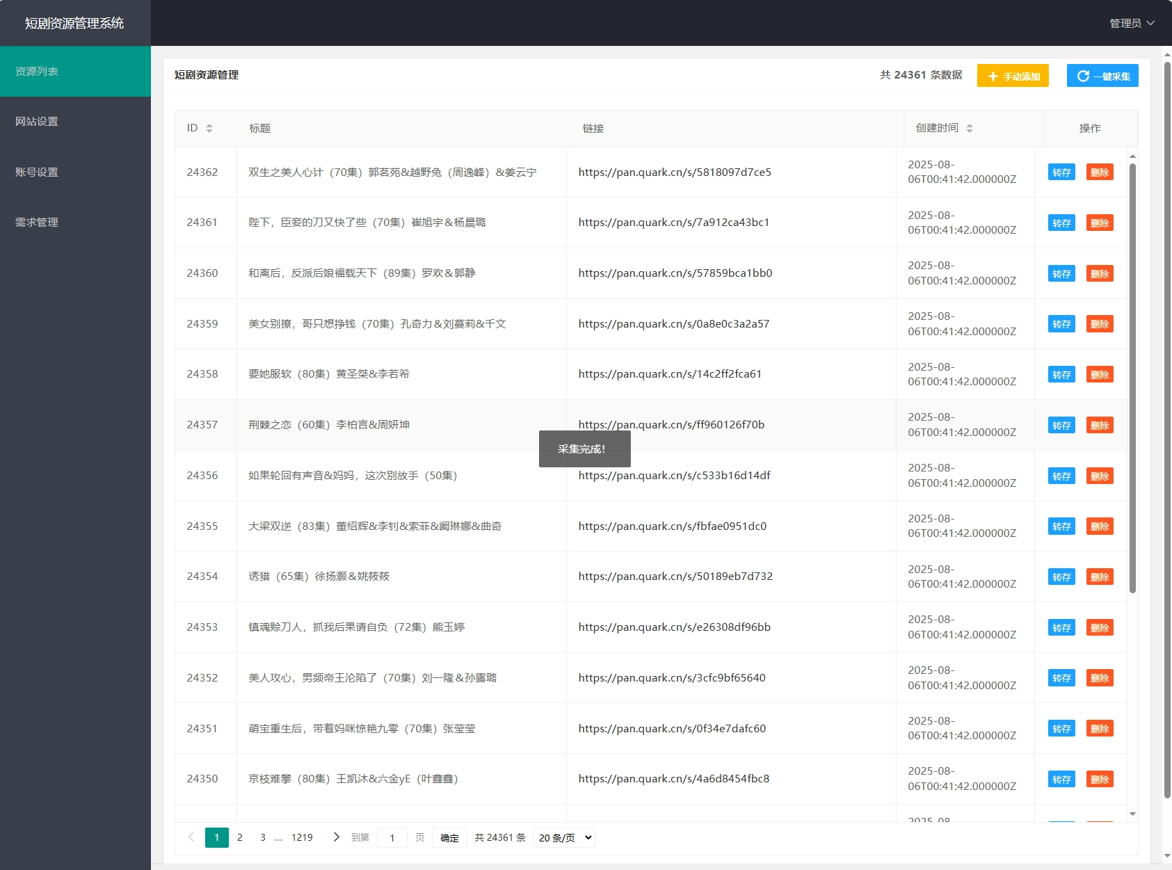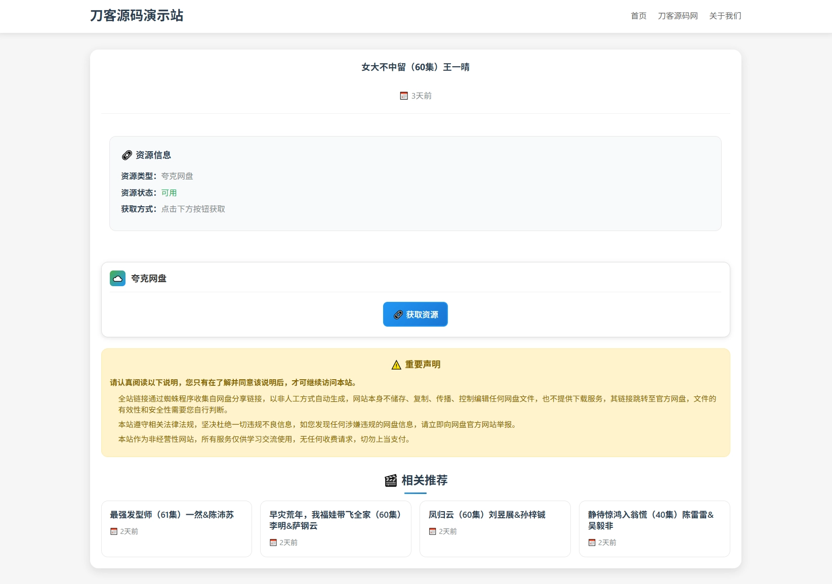 详情 评论 问答 文章最后更新时间:2026-01-26 23:35:38简介: 网盘短剧资源转存项目源码 支持夸克 带后台 附教程 安装教程: 测试环境:Nginx + PHP7.4 + MySQL5.7 数据库信息配置文件:.env 网站运行目录设置为:public 图片: 免费资源网盘短剧资源转存项目源码 支持夸克 带后台 附教程资源下载夸克网盘点击下载 为这篇文章评分 平均评分 0.0 共0位网友评分 0人 0人 0人 0人 0人 举报该内容 © 版权声明 All Rights Reserved 免责声明:本站提供用户下载的所有资源均来自网络,版权归作者本人所有,仅限学习和研究目的的,请支持正版! 我们非常重视版权问题,如有侵权请邮件与我们联系处理。敬请谅解!邮件:za178239@vip.qq.comTHE END网站源码 喜欢就支持一下吧!点赞53 分享QQ空间微博QQ好友海报分享复制链接收藏 如何下载资源? 您可以通过搜索或浏览分类列表来寻觅您期望下载的资源。随后,点击资源介绍页右侧的下载链接按钮,依据提示信息进行操作即可。 是否需要充值才能下载? 大部分资源可积分免费下载,部分资源须付费才能下载。 下载的资源是否有版权? 本网站提供的下载资源均为网络搜集,仅供个人学习和交流使用。对于版权问题,请用户自行判断并承担相应责任。